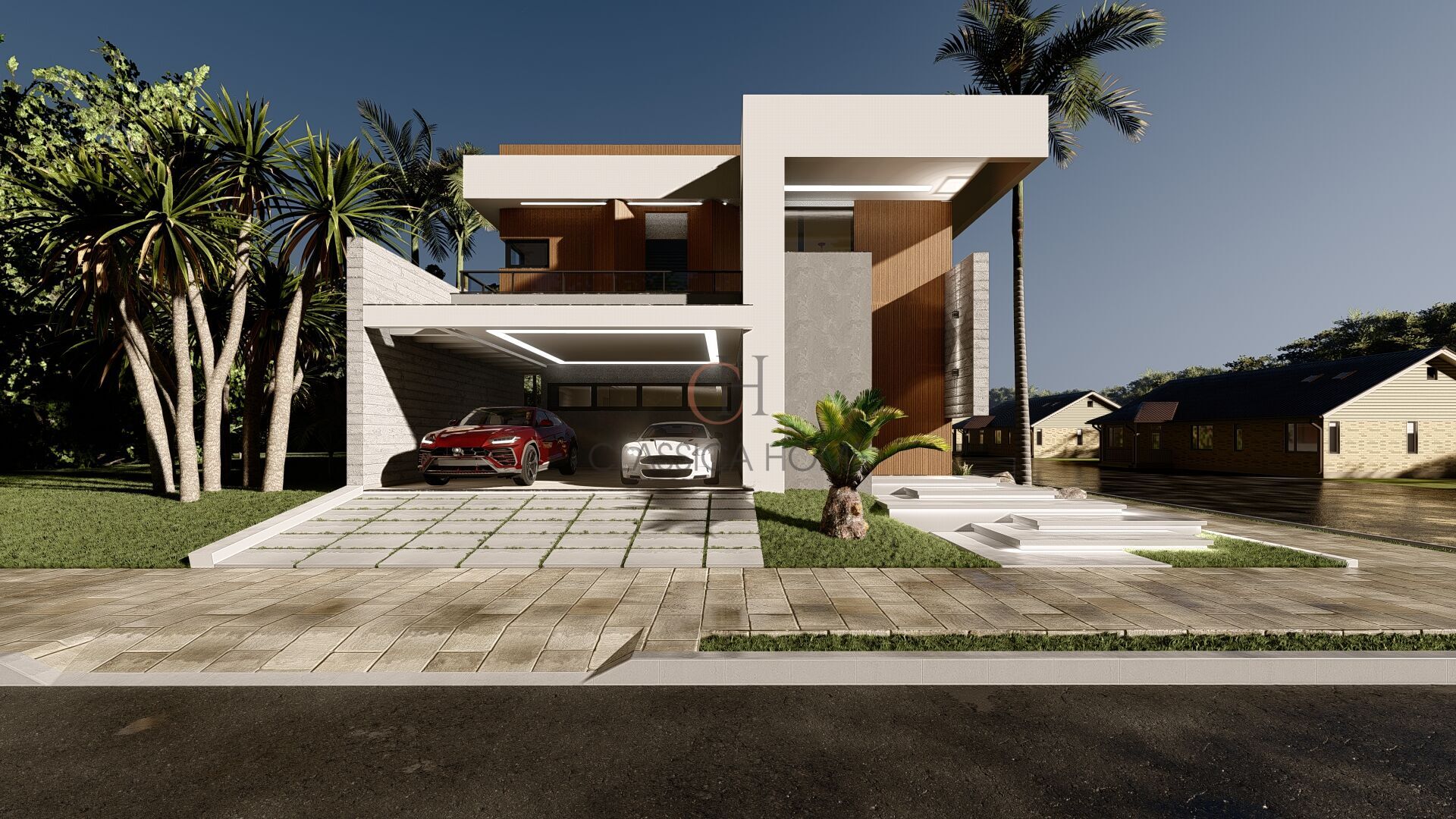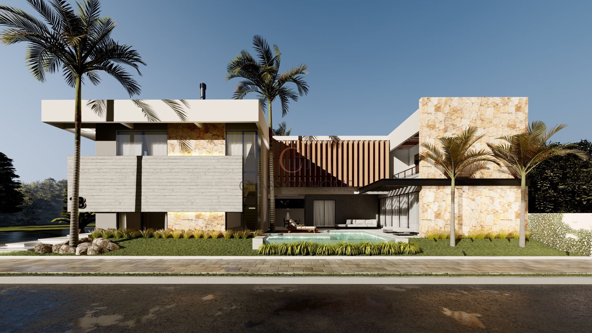 - Fachada imponente com acabamento em pedras naturais e elementos em madeira, que conferem um toque de calor e sofisticação ao visual moderno.